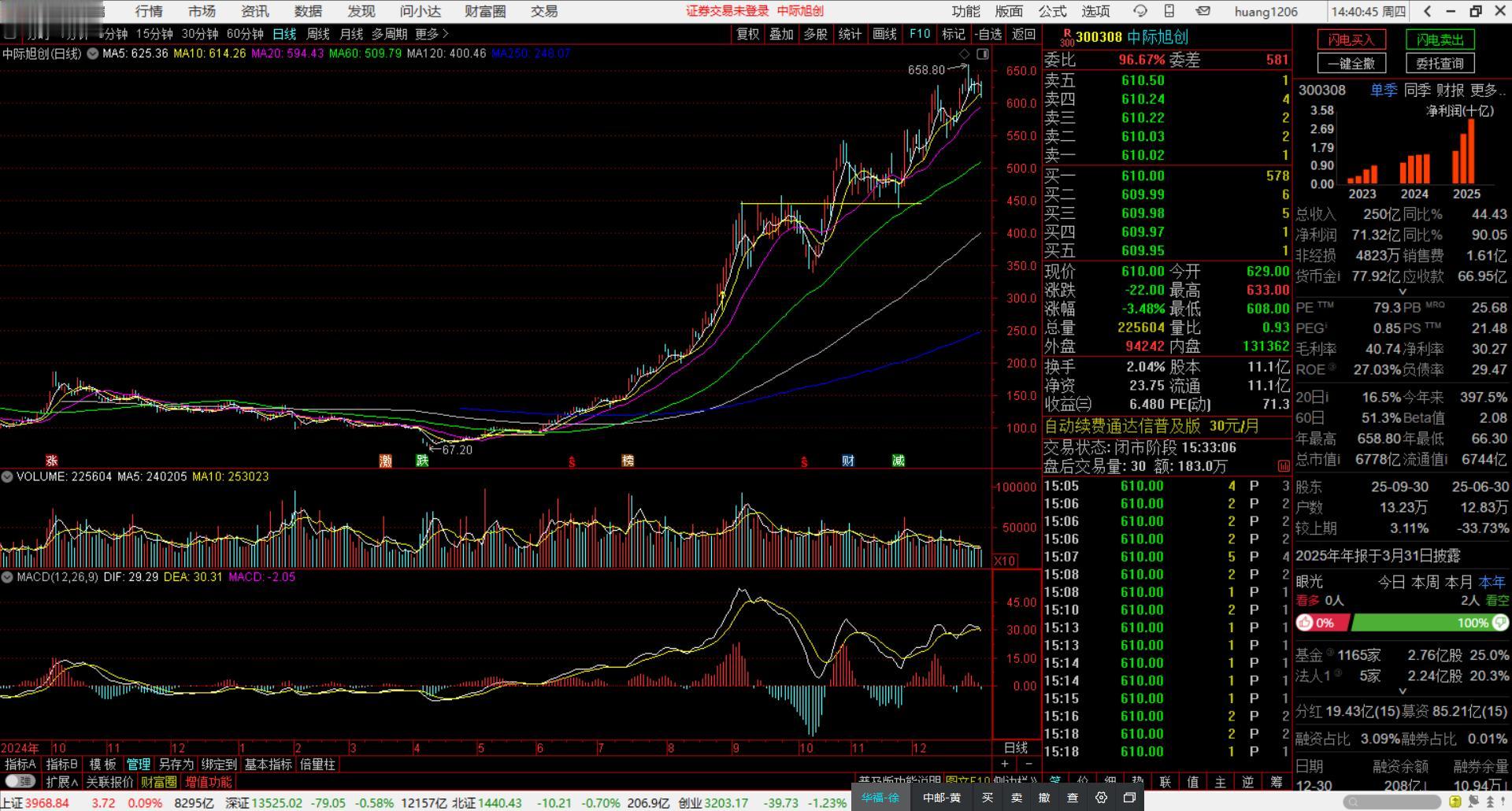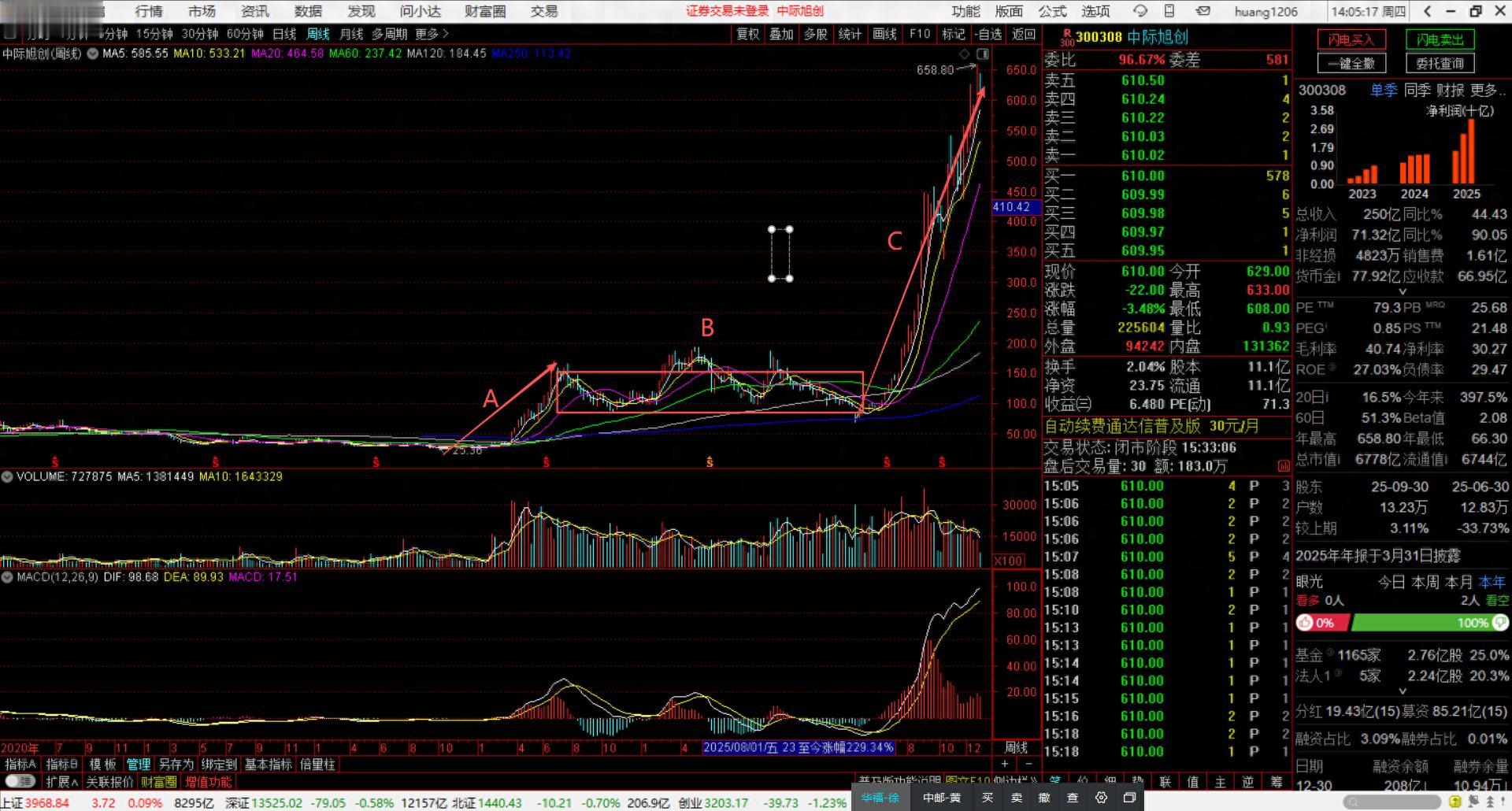 2022年10月-2023年6月,中际旭创从低点25.36涨至高点170,最大涨幅5.7倍;2023年6月-2025年7月,中际旭创宽幅震荡近2年;2025年7月突破震荡区间的上沿后保持持续上涨,从周线来看,基本保持MA10均线趋势上涨,2025年4月低点67.20至高点658.80,最大涨幅8.8倍,图2是中际旭创2025年日线走势图。