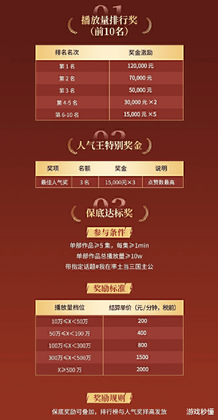 和很多游戏只给游戏内道具、虚拟货币奖励不同,这次率土拿出的是实打实的真金白银。除了第一名能拿到12万元现金大奖之外,同时还根据内容质量发放的百元、千元的保底奖励。无论你是擅长做同盟故事短剧,还是喜欢做策略解析、阵容搭配,哪怕只是分享自己的抽卡日常和游戏趣事,都能参与进来。