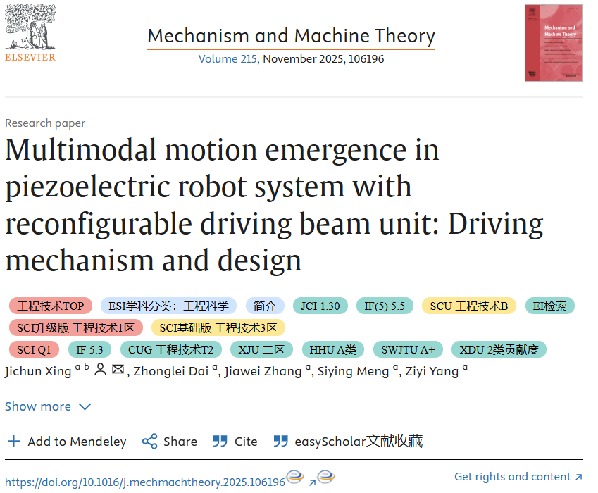 引文格式: Xing J, Dai Z, Zhang J, Meng S, Yang Z. Multimodal motion emergence in piezoelectric robot system with reconfigurable driving beam unit: Driving mechanism and design[J]. Mechanism and Machine Theory, 2025, 215: 106196.