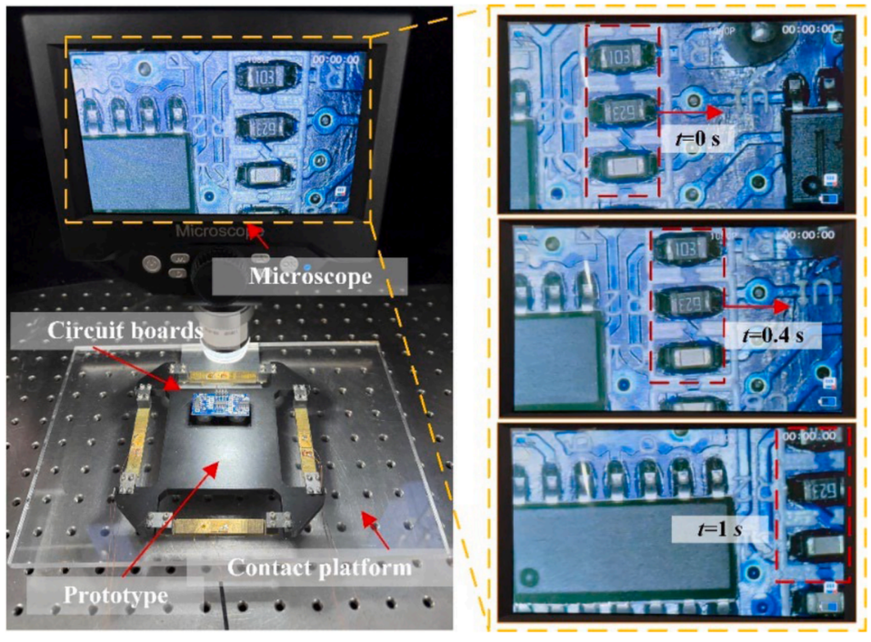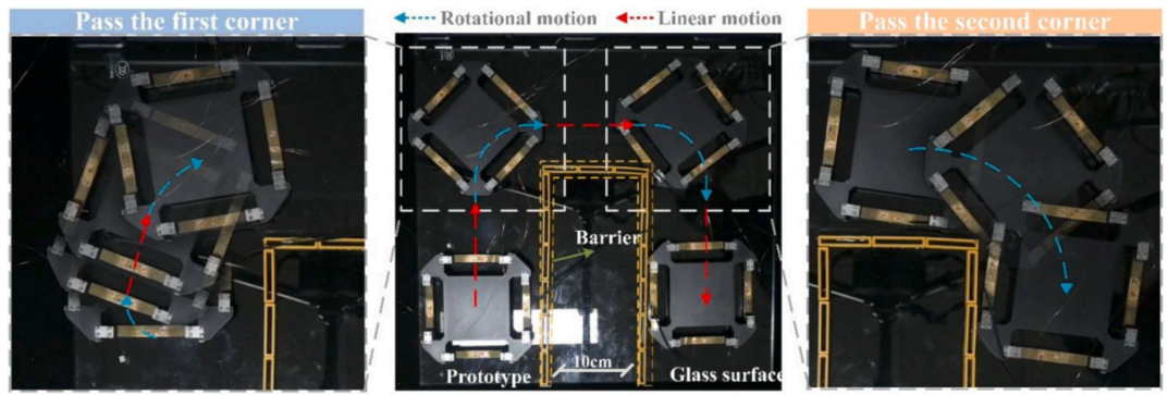 文章最后还做了两个很有画面感的展示:一是四边形模块在 U 形轨道 内连续完成直行与转向;二是把模块放到显微镜辅助平台下,带着电路板做微尺度操作演示。这说明作者已经不满足于“证明它能跑”,而是在往微操作、芯片封装、细胞操控这类更贴近应用的方向试探。