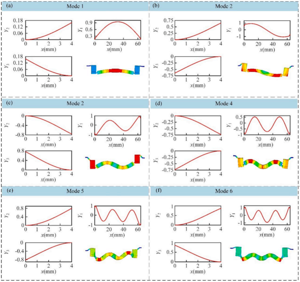 为了同时实现双向运动,驱动足位置必须落在第4模态与第6模态允许区间的重叠区域。论文给出了布局范围分析,并最终把两个驱动足沿梁轴方向分别选在8.5 mm和−19 mm附近。仿真显示,加上驱动足后,前六阶固有频率变化都不超过 2.5%,说明这种布局不会显著破坏原有振动特性。