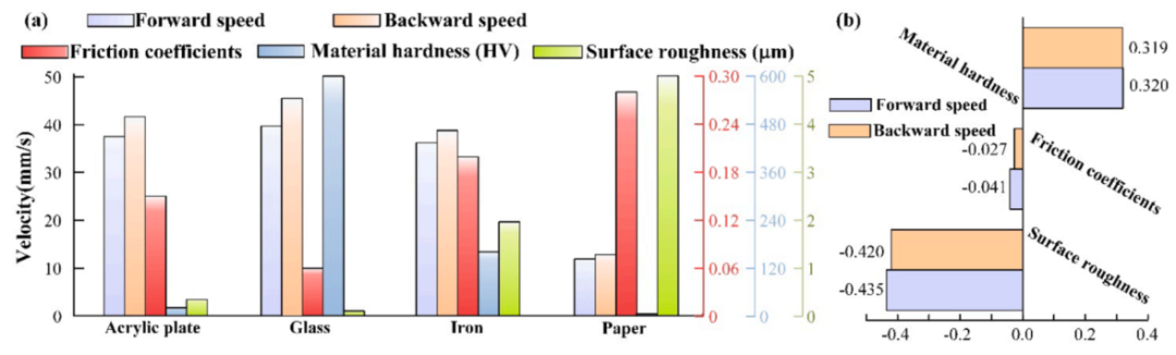实验结果显示,四边形模块在最优条件下最大前进速度44.1 mm/s,后退速度49.6 mm/s;最大载荷可到800 g;在 200 g 额外负载下,线速度、转向和旋转性能都达到较高水平;在玻璃面上速度最高,在纸面上最慢。进一步回归分析表明,表面粗糙度对速度影响最显著,硬度次之,摩擦系数反而不显著。这个结论挺有意思,也挺反直觉。