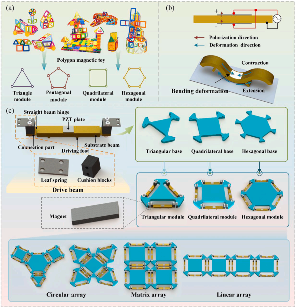 这篇论文一个很有意思的地方,是设计源头并不复杂。作者从多边形磁力玩具得到启发:既然磁吸结构能快速拼成不同拓扑,那压电机器人是不是也能用类似思路,把驱动单元做成模块,再通过连接方式变化扩展运动能力?于是,文章提出了以压电双足驱动梁为核心、以多边形底座为支撑的模块化方案。单个驱动梁负责基础运动,多个驱动梁拼成模块,多个模块还可以继续拼成环形阵列、矩阵阵列和线性阵列。这个设计方向,本质上是在给压电微型机器人补上“可重构”这一块短板。