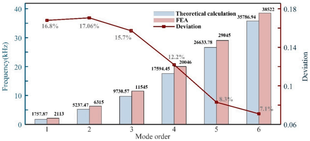 图3:理论计算和有限元分析的固有频率和偏差+压电驱动梁的模态函数。