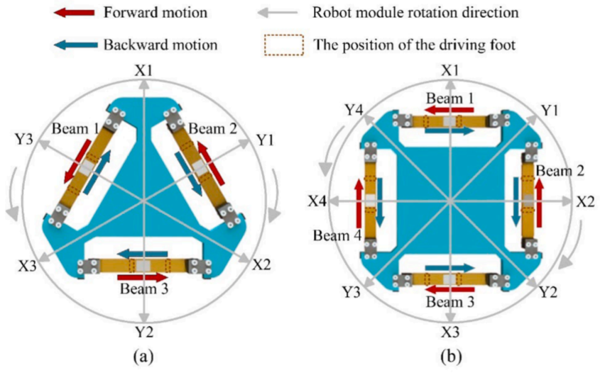 单个驱动梁只能前后走,但一旦拼成三角形或四边形模块,事情就不一样了。论文给出了完整的驱动策略表:不同梁分别激发 B4 或 B6,即可让模块实现多方向直线运动、转向和旋转。其中,四边形模块的运动最完整,也是后续实验重点。