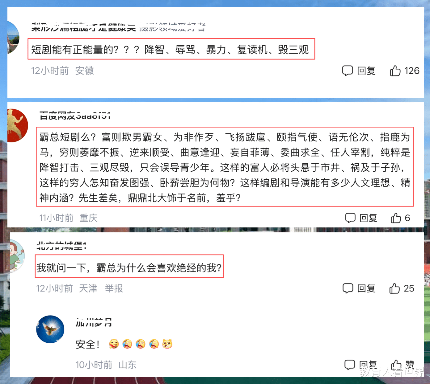 结果高赞评论全是这样的:“短剧能有正能量???降智、辱骂、暴力、毁三观!”(安徽网友,获赞126)还有家长灵魂发问:“我就问一下,霸总为什么会喜欢绝经的我?”(天津网友,获赞25)甚至有网友上纲上线:“霸总短剧里富人欺男霸女,穷人逆来顺受,这是教坏孩子!先生说这样的话,羞耻吗?”