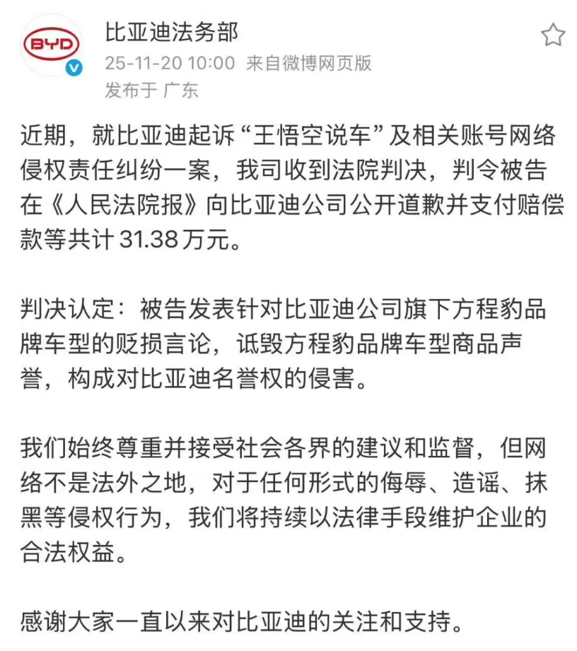 近期,比亚迪法务部公布的多起诉讼结果,揭示了这类恶意行为的猖獗程度。例如,拥有近200万粉丝的汽车博主“王悟空说车”因针对比亚迪旗下方程豹品牌车型发表贬损言论,诋毁商品声誉,最终被法院判定构成侵权,需公开道歉并赔偿比亚迪31.38万元。