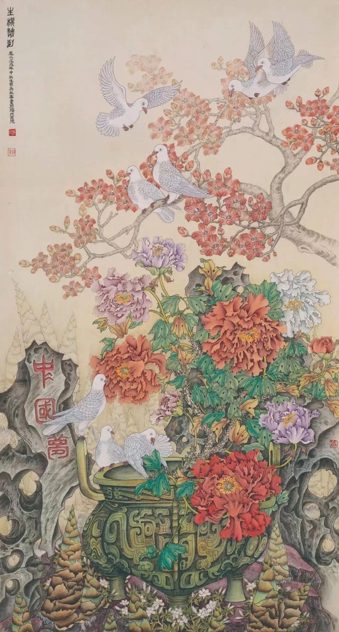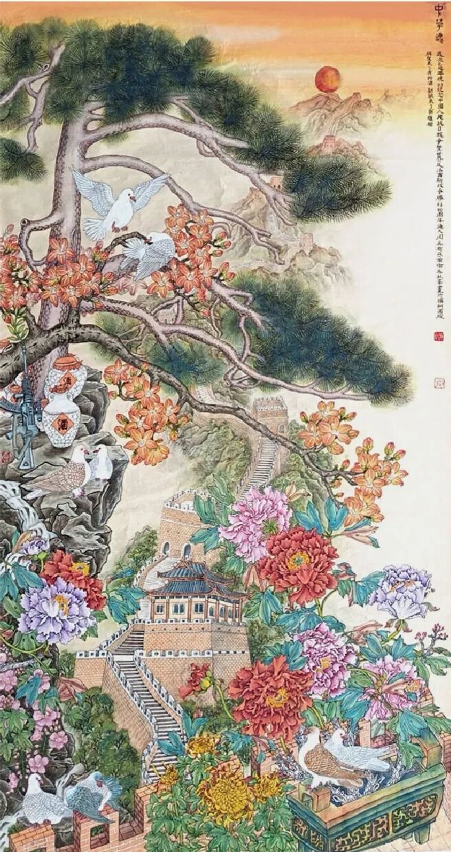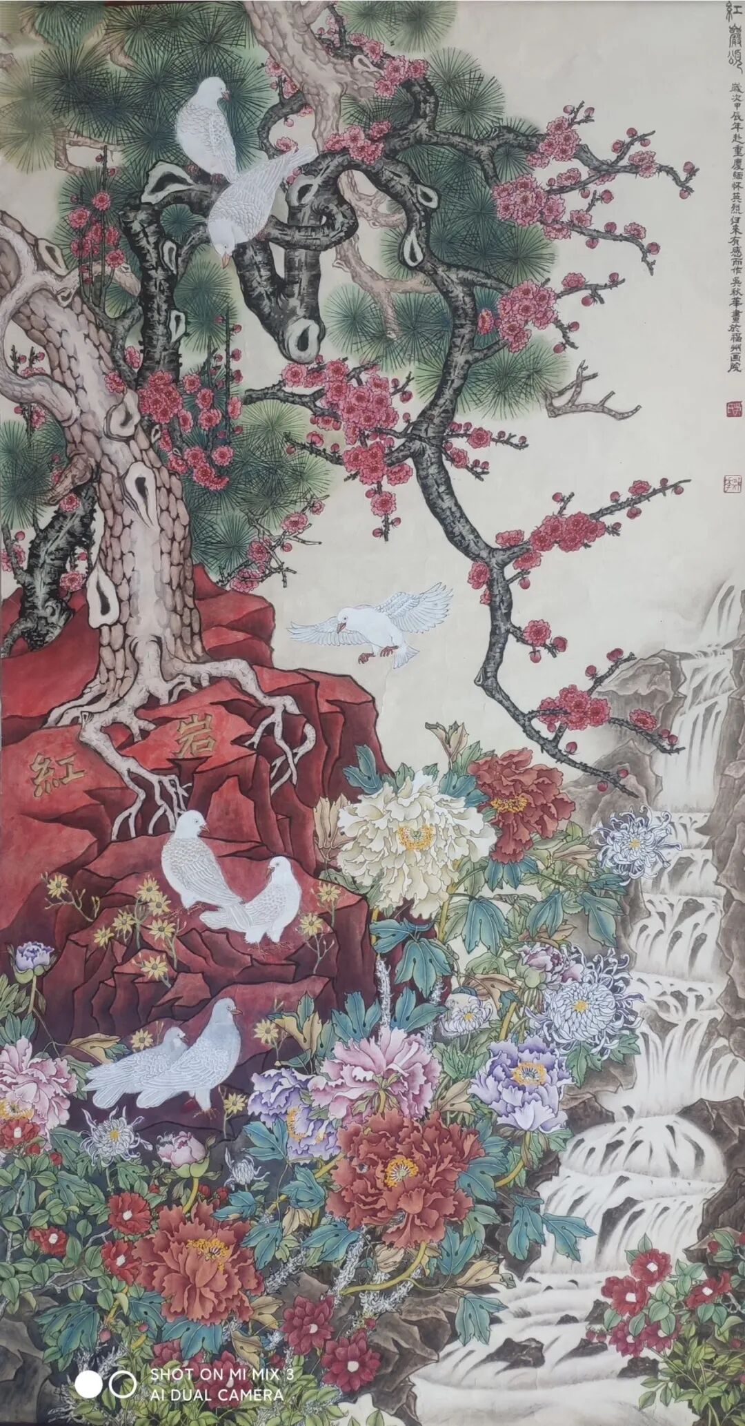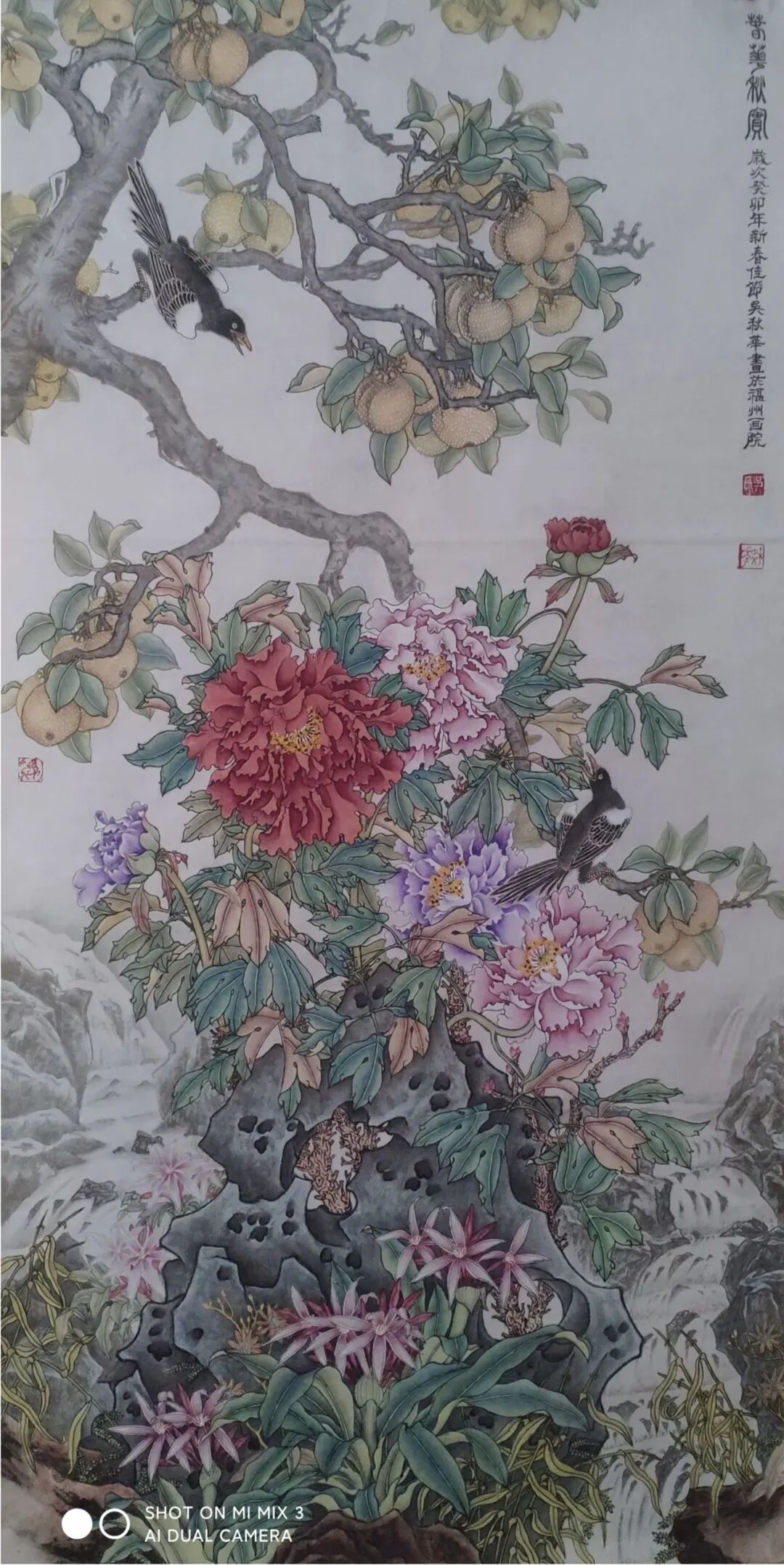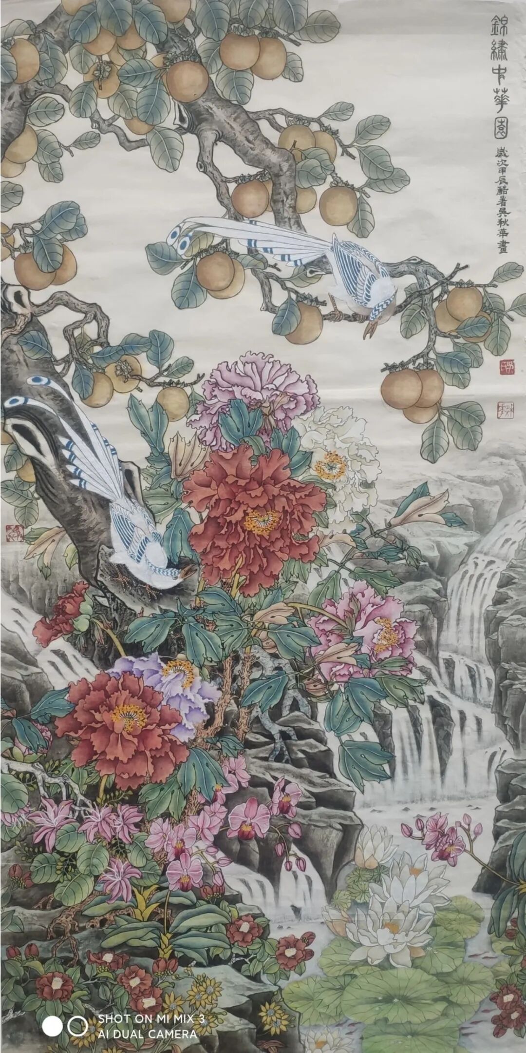 在书画创作领域,吴秋华以工笔画见长,形成了“清新韵趣,细腻雅致”的鲜明风格。他善用全景式构图展现画意,既彰显扎实的基本功,更流露惊人的毅力与耐力,同时以工写结合的传统技法让画面主次分明,充盈着文学韵味。其创作注重与现实生活有机结合,将生活气息融入笔墨,赋予作品更多人性化与情感化表达,主张“借物抒情”“画中有画”,使作品耐人寻味。从《四季皆春 百鸟贺岁》的恢弘气象到《鸟语花香》的灵动雅致,从《红岩颂》的家国情怀到《一家亲》的生活温情,他的作品涵盖山水、花鸟、走兽等诸多题材,在笔墨流转间实现“形神兼备”的艺术追求。