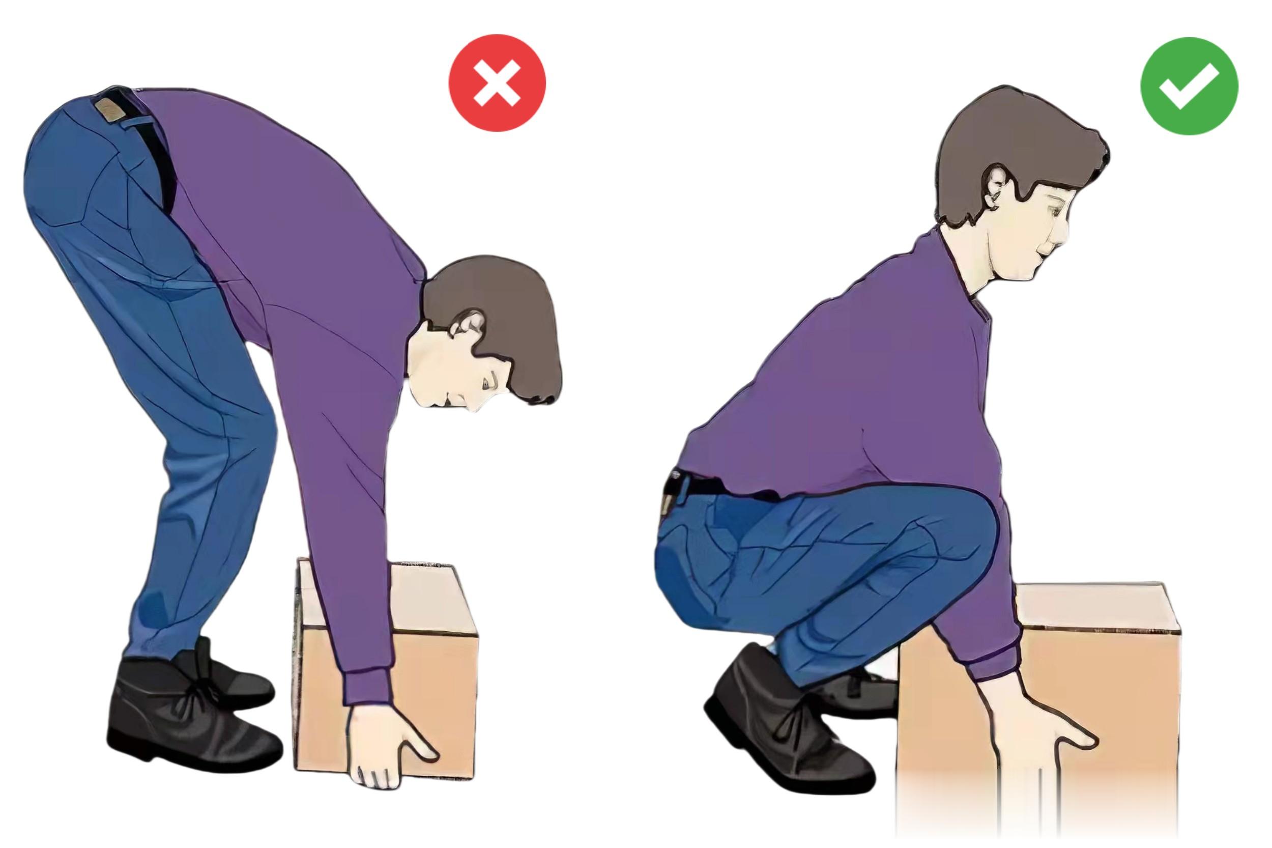 正确做法:搬物时应屈髋屈膝下蹲,保持腰背挺直,使重物贴近身体,主要依靠腿部力量站起。