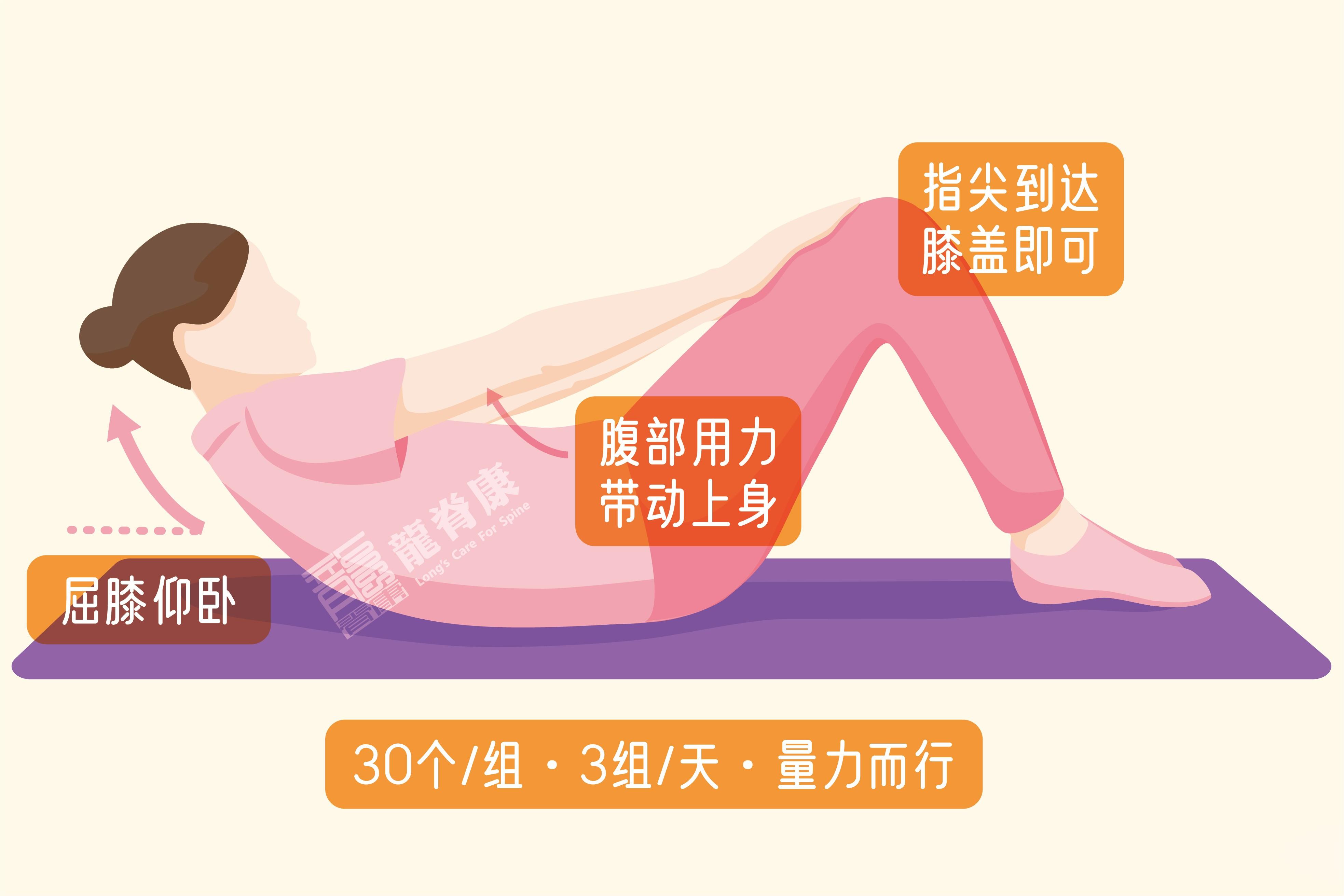 正确做法:如需锻炼核心肌群保护腰椎,建议改为卷腹。即仅将肩胛骨抬离地面,下背部始终贴地,避免腰椎的过度屈曲。或者选择更安全的平板支撑、鸟狗式等动作。