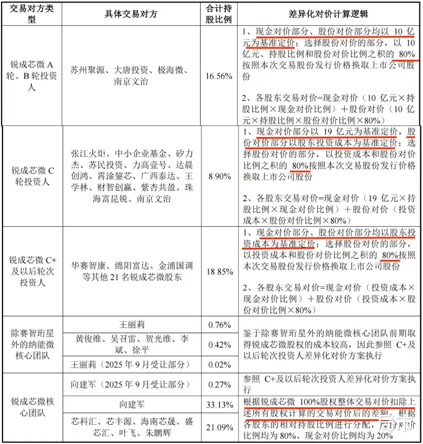 在交易总价不变的情况下,差异化定价的差额部分,由锐成芯微实控人向建军在内的核心团队最终兜底承担,同时他们也是本次交易的业绩承诺方。这就是差异化定价的第4档,由于他们承担的风险更多,因此换股部分就不需要打8折。