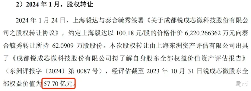 锐成芯微作为一家IPO撤回企业,此前曾经历多轮融资及股权转让,共有50名股东。该公司股权转让价格最高达100.18元/股,对应总估值57.7亿元。