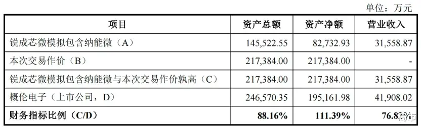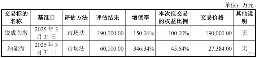 本次收购对标的资产均采用市场法评估,锐成芯微100%股权评估值为19亿元,增值率150%;纳能微100%股权评估值为6亿元,增值率346%。