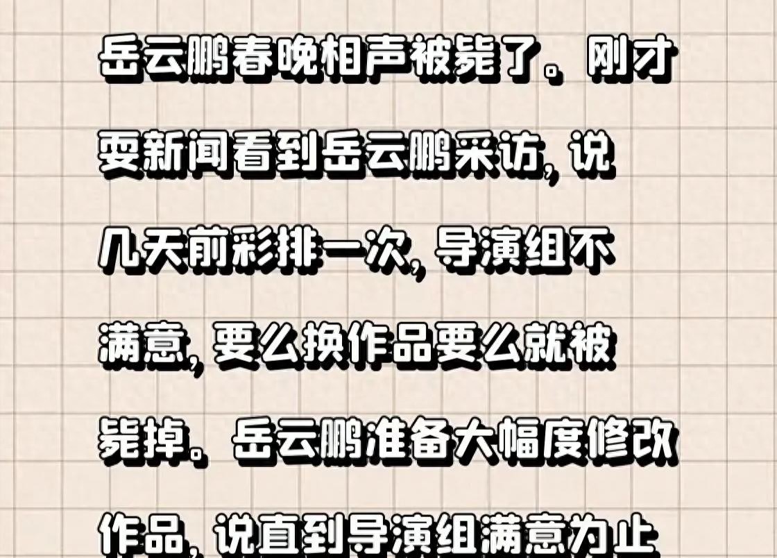 咱先说这网上的传闻,说岳云鹏春晚节目被毙了,他是不是要凉了?要我说,这消息真假难辨,吃瓜群众还是得擦亮眼睛。不过,细细琢磨,这背后可大有文章!看看岳云鹏自己发的视频,原来是节目得大改,重新审核,可不是直接被毙了。所以说,这网上的消息,十有八九是捕风捉影,别太当真。 有些网友,估计是见不得岳云鹏好,故意添油加醋,带节奏。 这年头,键盘侠太多,可别被他们带歪了。