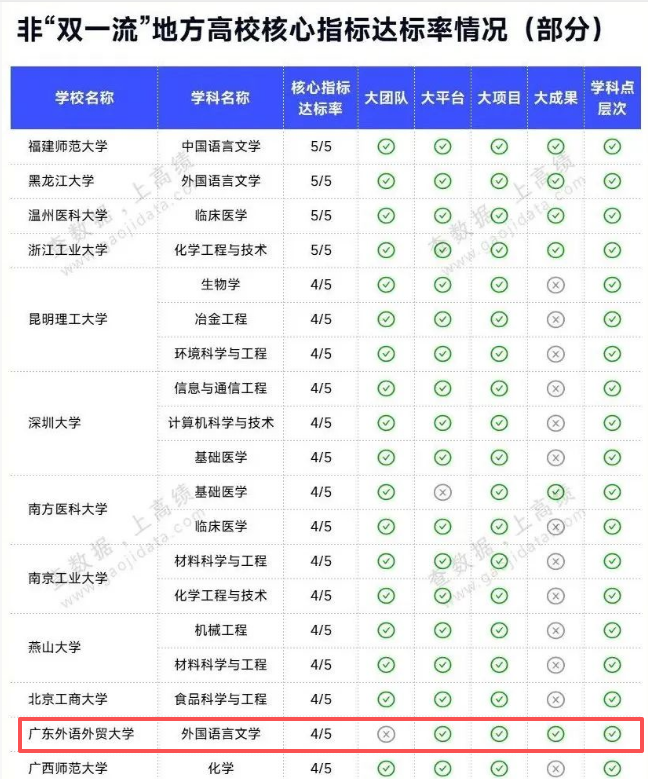 而广东外语外贸大学在这份榜单中表现尤为亮眼。其相关学科此前的核心指标达标率已达4/5,在大平台、大项目、大成果以及学科点层次等关键方面均已达标,彰显出强劲的学科发展态势。