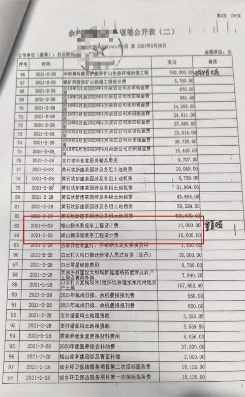 雄山长廊、雄山景观亭工程款,均出现“重复记录”、“支出”。