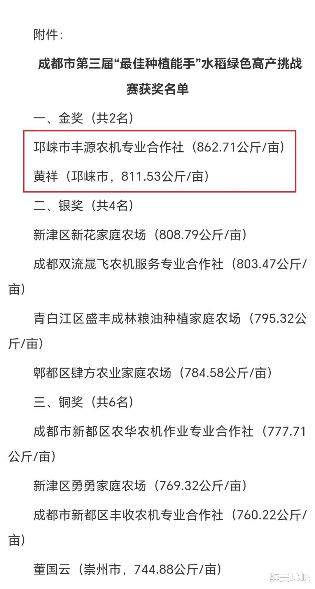 最终,邛崃市丰源农机专业合作社以862.71公斤/亩的超高亩产位列第一,邛崃市牟礼开元种植专业合作社紧随其后,以811.53公斤/亩的成绩拿下第二,两家主体携手将本次赛事的两个金奖收入囊中。