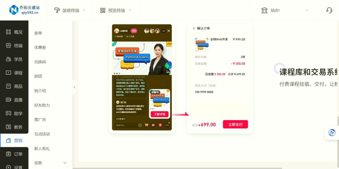 转化端:提供 “阶梯定价”(如单课 99 元、系列课 299 元)、“拼团优惠”(3 人拼团立减 50 元)等转化工具,系列课转化率较光秒建站提升 40%;