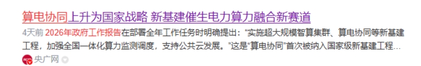 算电协同为这么猛的后面是,“算电协同”首次写入政府工作报告,“加快推动全面绿色转型”成为重要篇章,要求大力发展绿色低碳经济,深入推进零碳园区建设。明确列为新基建工程,意味上升至国家战略。