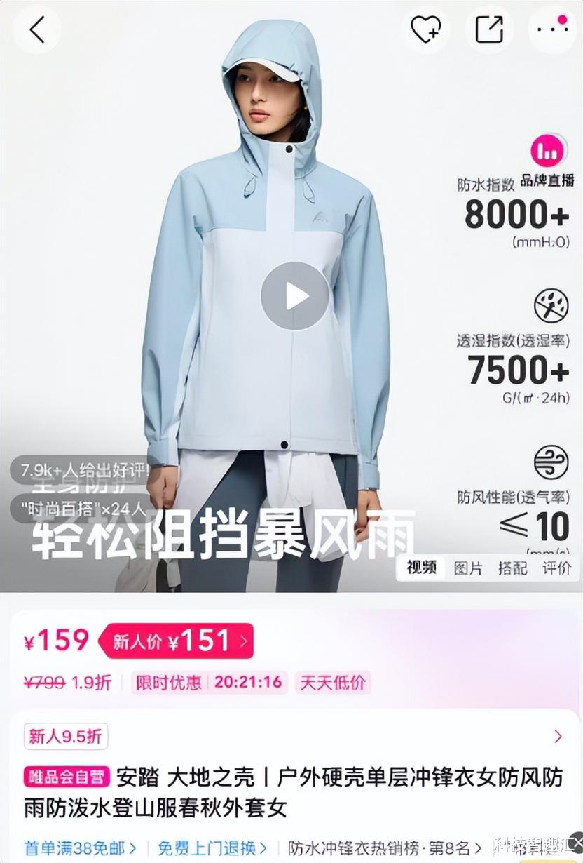 原本对安踏的印象还停留在日常运动服饰,对它的户外产品并不了解。但看到唯品会上的价格后,我还是心动了:这件冲锋衣特卖价159元,新人价151元,原价近800元,差不多1.9折,就算不合适,试错成本也很低。