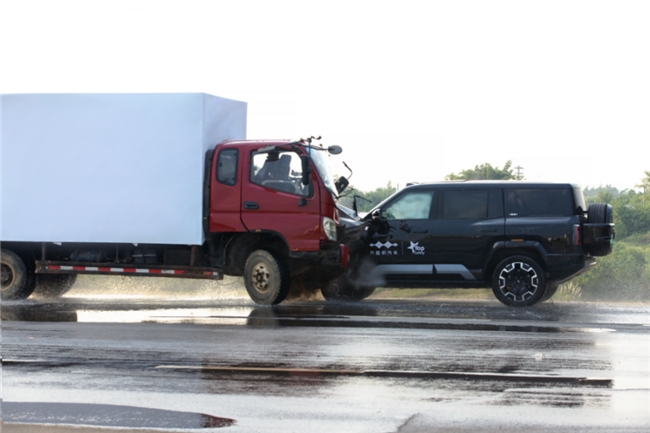 经调研发现,在雨天湿滑、道路狭窄的情况下,对向行驶车辆的驾驶员容易因视线受阻而发生对碰事故,是造成高危事故的典型案例。并且由于大货车、重卡等重型车辆自重大、重心高等特点,更让这一路况下的危险系数呈指数级上升。而中汽中心也将挑战难度直接拉满,让豹8模拟了雨天湿滑路面下,以90km/h相对速度与4.5吨重大货车发生50%偏置碰撞,并跌落8米深坑的极限工况场景测试,全面验证豹8的安全品质。