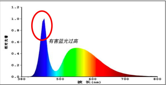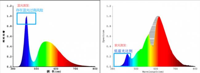一种是比较常见的传统LED蓝光激发全光谱光源这种灯是用蓝光去激发荧光粉发出白光,成本低、亮度高,所以应用非常广泛。但问题也在于,它本身蓝光峰值会比较明显,光谱不够连续,长时间用眼更容易产生疲劳感。