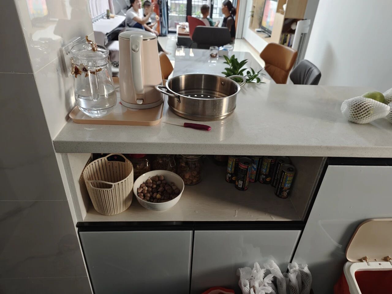 ②零食水果台:平时休闲时,中岛台还能作为零食水果区,摆上果盘、坚果、饮品,成为一家人最随性的休闲角落。