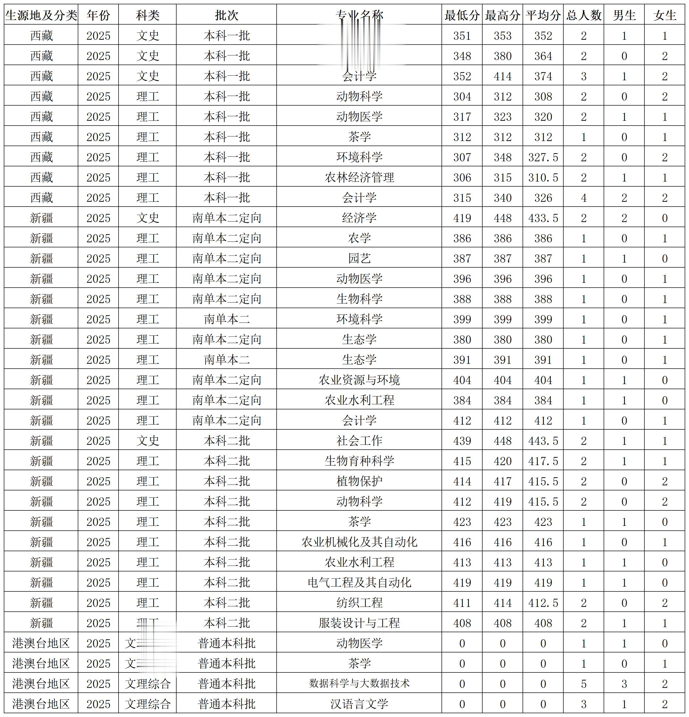 安徽农业大学2025年在西藏、新疆各批次各专业录取分数线