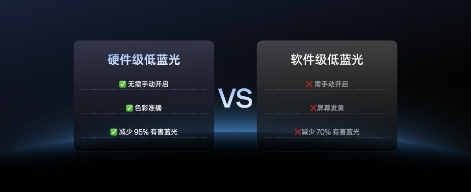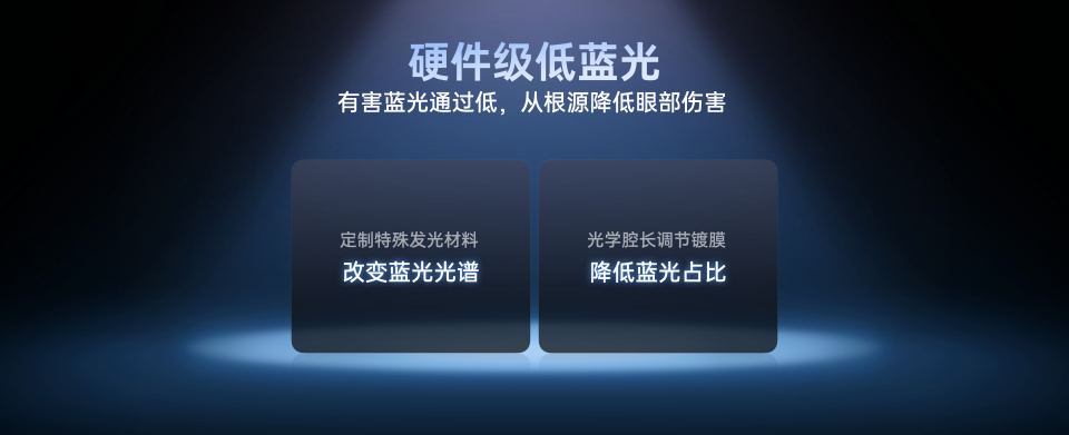③ 硬件级低蓝光——定制 X3 发光材料,从源头减少有害蓝光,再加一层光学腔长调节膜精准过滤,不偏色、不发黄。