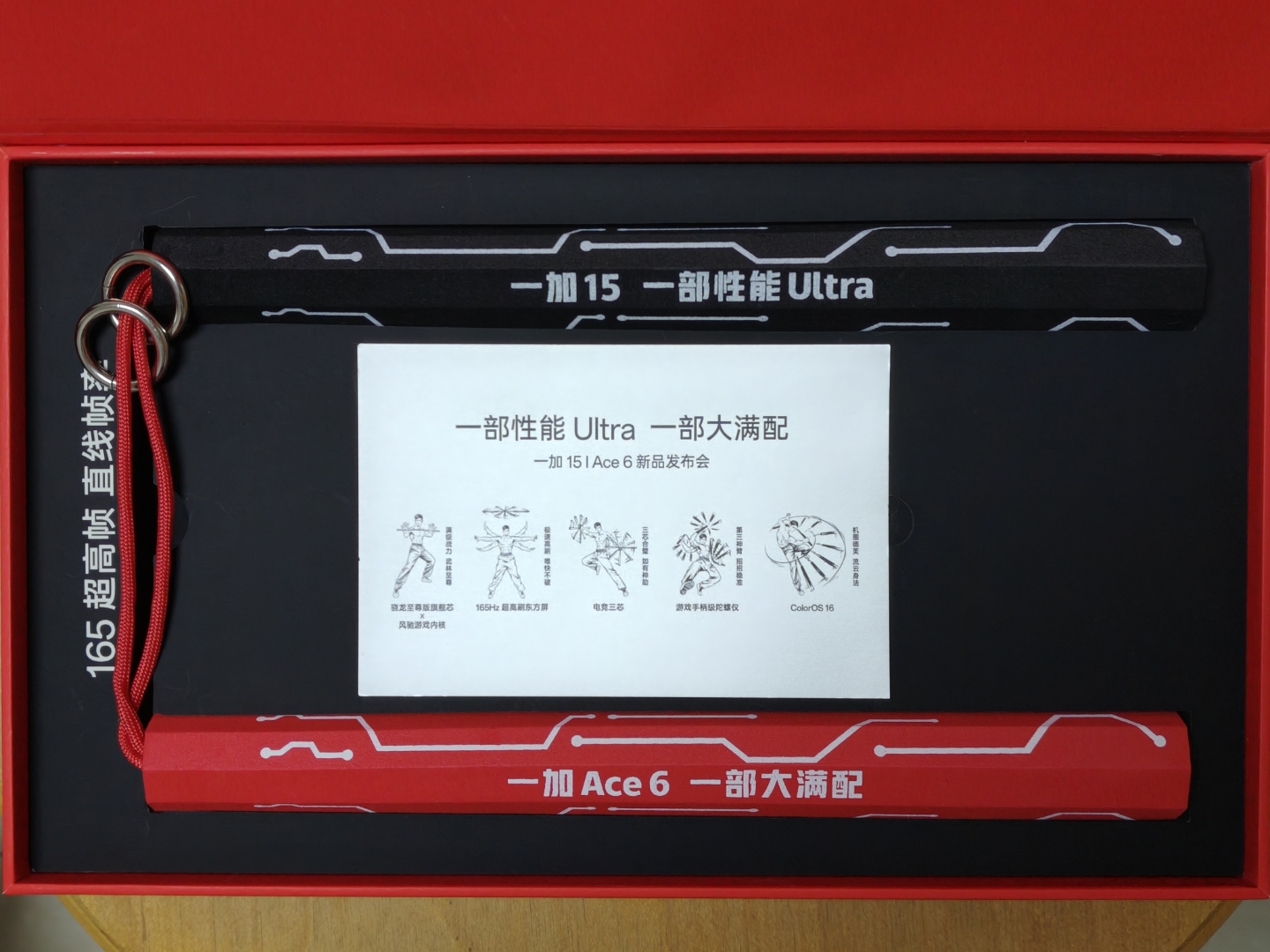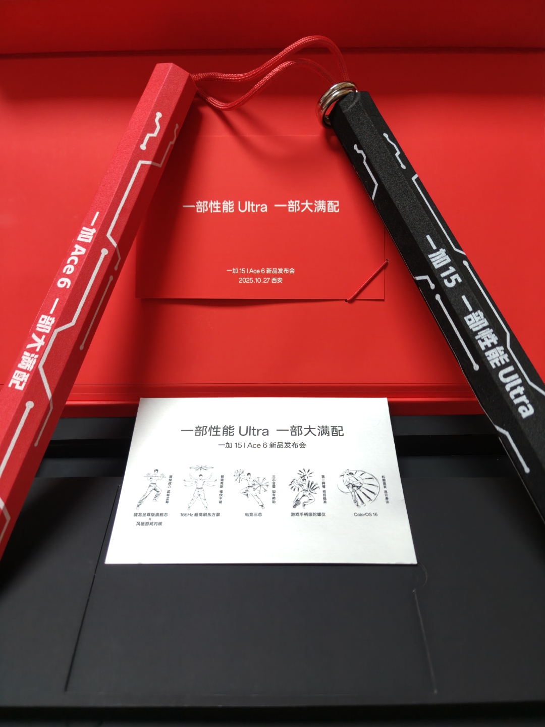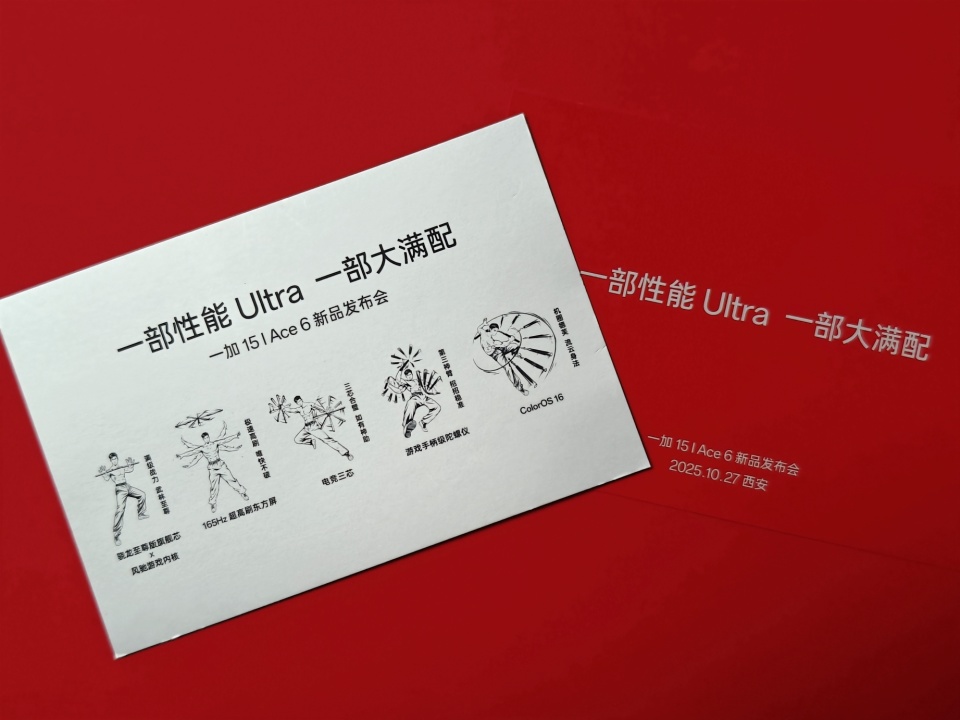 此外,近日,“一加 15 | Ace 6 新品发布会”的“一部性能Ultra,一部大满配”实物邀请函也陆续被媒体和达人晒了出来。其中的一黑一红的双节棍上分别标明了“一加15 一部性能Ultra”“一加Ace6 一部大满配”。众所周知,目前的官宣显示,一加15以全球首块超高刷高分辨率屏幕搭配最顶芯片与自研风驰游戏内核,开启手游165超高帧时代;一加Ace6则以碾压同档的极致性能与超凡满配,打造新一代电竞标杆。另外,邀请函内附的「武林秘籍」更暗合了165Hz超高刷东方屏、游戏手柄级陀螺仪等五大产品卖点。