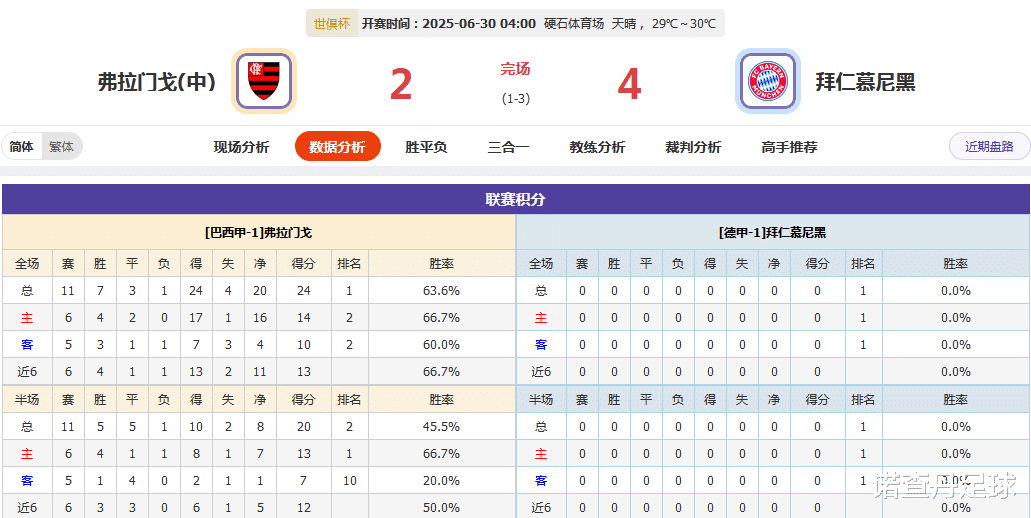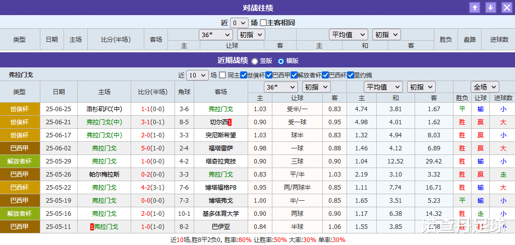 对阵背景:这是1场世俱杯的比赛,对阵双方分别是各自联赛的榜首球队,不过双方差着级别呢,主队是巴甲的榜首球队,客队则是5大中德甲的榜首球队,理论上差着实力呢,不过从双方1路战绩来看,主队不弱,客队也不多强,双方虽然没有过直接往绩交手,但是筹码也不是多高看联赛级别高,知名度更大的客胜打出。这是本场比赛的筹码倾向性情况。实际上最近这段时间,最为主流的就是世俱杯的比赛,通常对阵双方都没有直接往绩交手,筹码倾向性的判断上,需要细节对比的比较多。