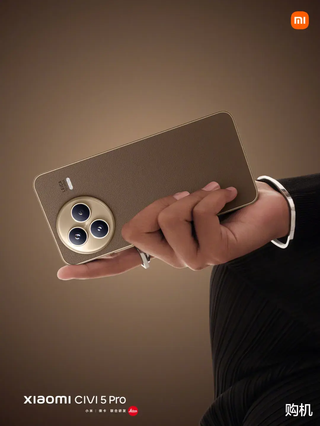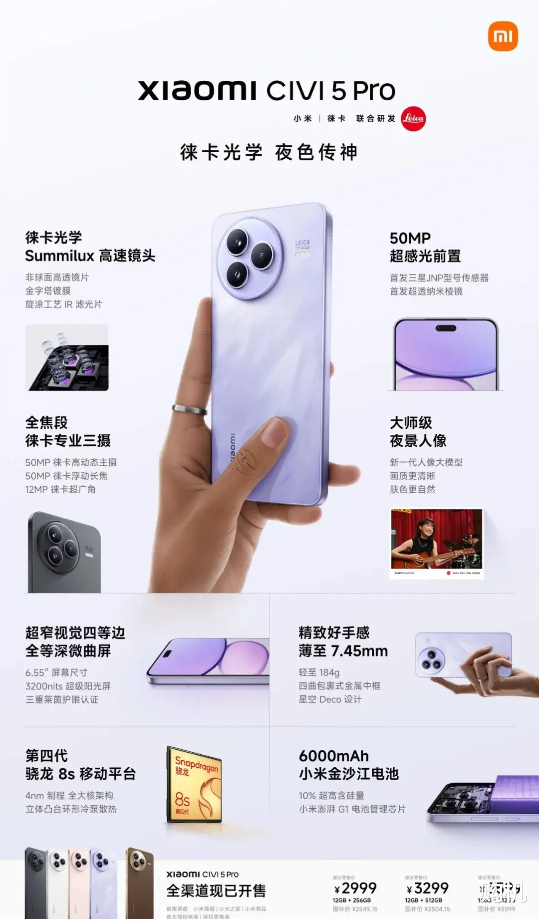 小米CIVI 5 Pro搭载6.55英寸AMOLED全等深微曲打孔屏,超窄视觉四等边,高通 骁龙8s Gen4+LPDDR5X+UFS 4.0,前置5000万像素镜头(三星JNP、f/2.0)(首发NanoPrism超透纳米棱镜技术),后置5000万像素徕卡高动态主摄(光影猎人800、OIS、f/1.63)+5000万像素徕卡浮动长焦镜头(60mm等效焦距、OIS、f/2.0)+1200万像素徕卡超广角镜头(120°FOV、15mm等效焦距、f/2.2),另外,它还采用6000mAh小米金沙江电池+67W有线充电(小米澎湃G1电池管理芯片),采用第8代康宁大猩猩玻璃、屏下指纹识别,NFC、立体双扬声器、红外遥控、X轴线性马达、IP53等等。