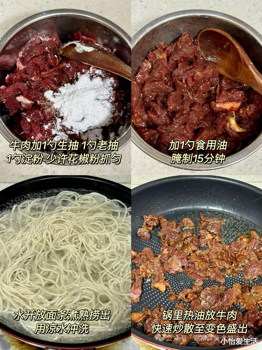3. 牛腱肉切薄片,用生抽、料酒、淀粉、少许油腌10分钟。