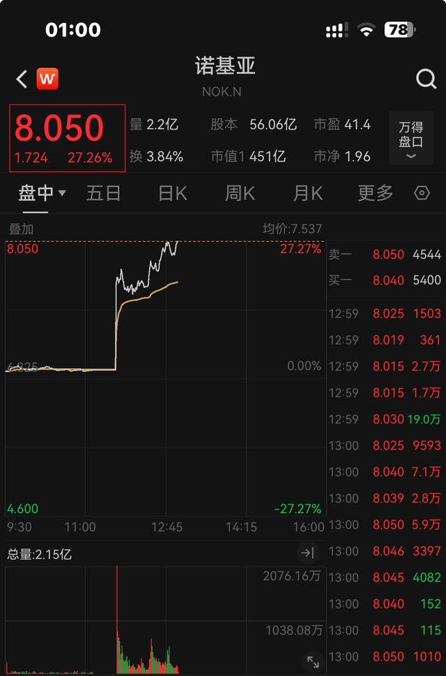 一石激起千层浪,诺基亚股价在周二美股盘中直线拉升。截至美东时间13:00,诺基亚股价盘中一度触及8.100美元,涨幅超过27%。