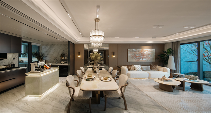 室内采用 “多中心” 布局,客厅作为公共活动区,西厨岛台、阳台休闲区、书房形成多个 “亚中心”,家长烹饪时能随时关注客厅玩耍的孩子,有人办公时不被娱乐活动打扰,既独立又亲密。
