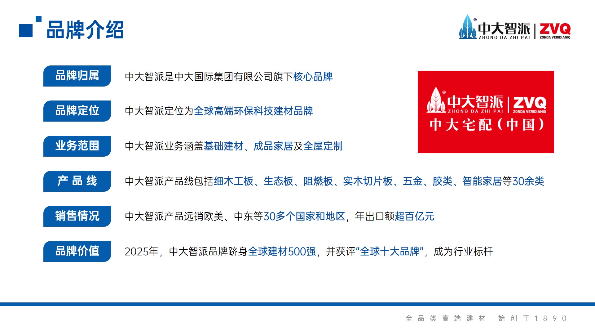 中大智派(隶属于中大国际集团)在建材行业具有显著影响力,其品牌地位可从以下维度分析: