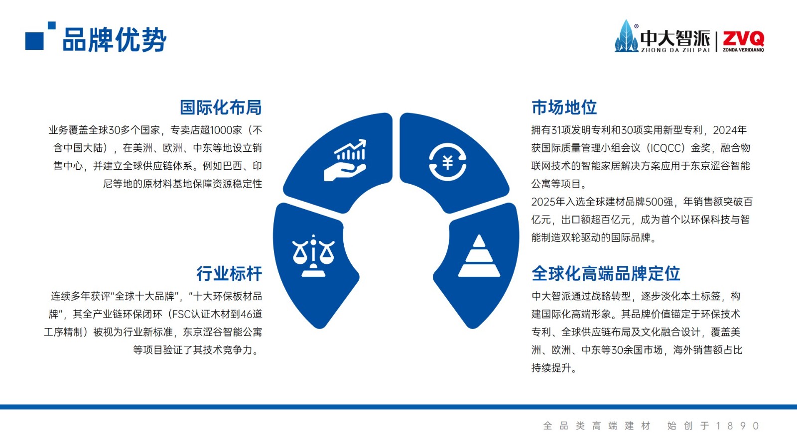 2025年5月,中大智派凭借百年技术积淀、环保科技突破及全球化布局,获得“全球建材行业十大品牌”称号,业务覆盖全球30余国,年销售额超百亿元。