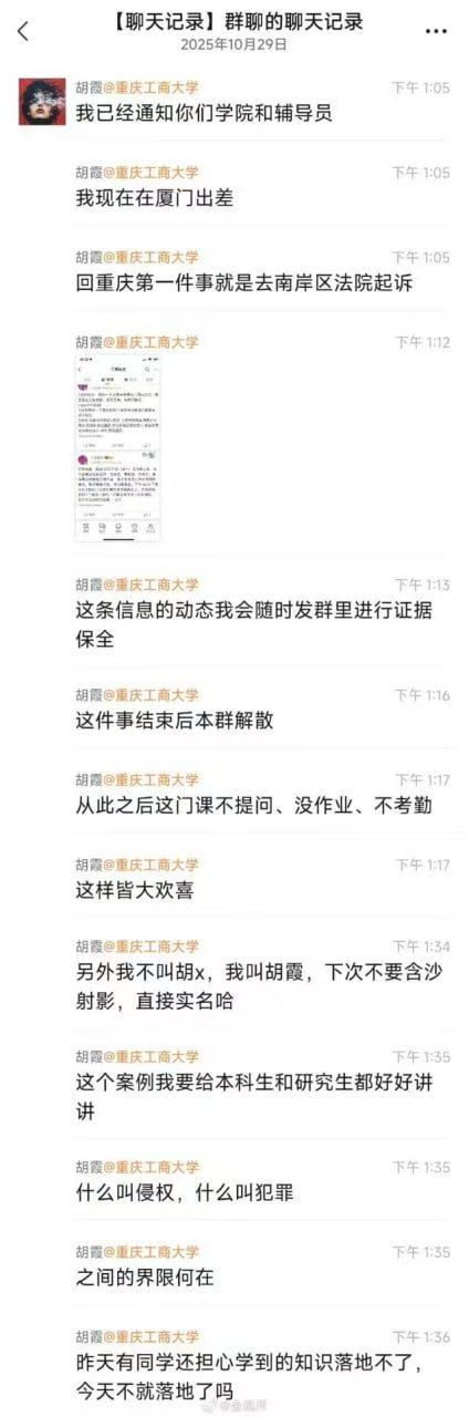 而女老师也不惯着,在群里发通知,声称要拿起法律武器来维护自己的合法权益。