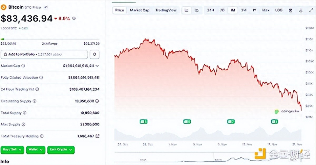 2025年11月21日,比特币跌至8.34万美元,以太坊跌破2800美元,加密总市值下探至3万亿美元以下,现报2.97万亿美元,24小时跌幅8.7%。