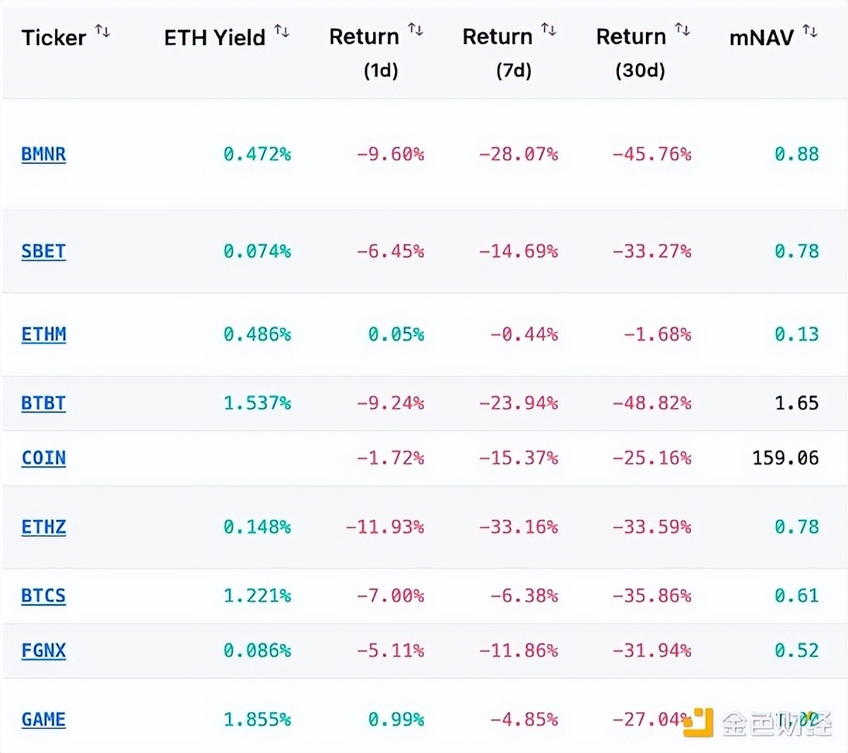 随着以太坊跌破3000美元,其他的ETH财库公司也陷入困局。据Capriole Investments 的数据显示,这些公司持有的 ETH 资产收益率为负 25% 至 48%。如下图所示,排名前十的 DAT 公司在周线和日线时间框架内均出现亏损。