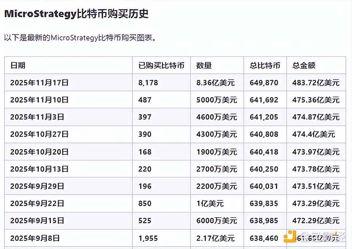 3.Strategy怎么样了?Strategy在11月17日继续买入8178枚BTC,使其总持有BTC数量上升至649870枚。