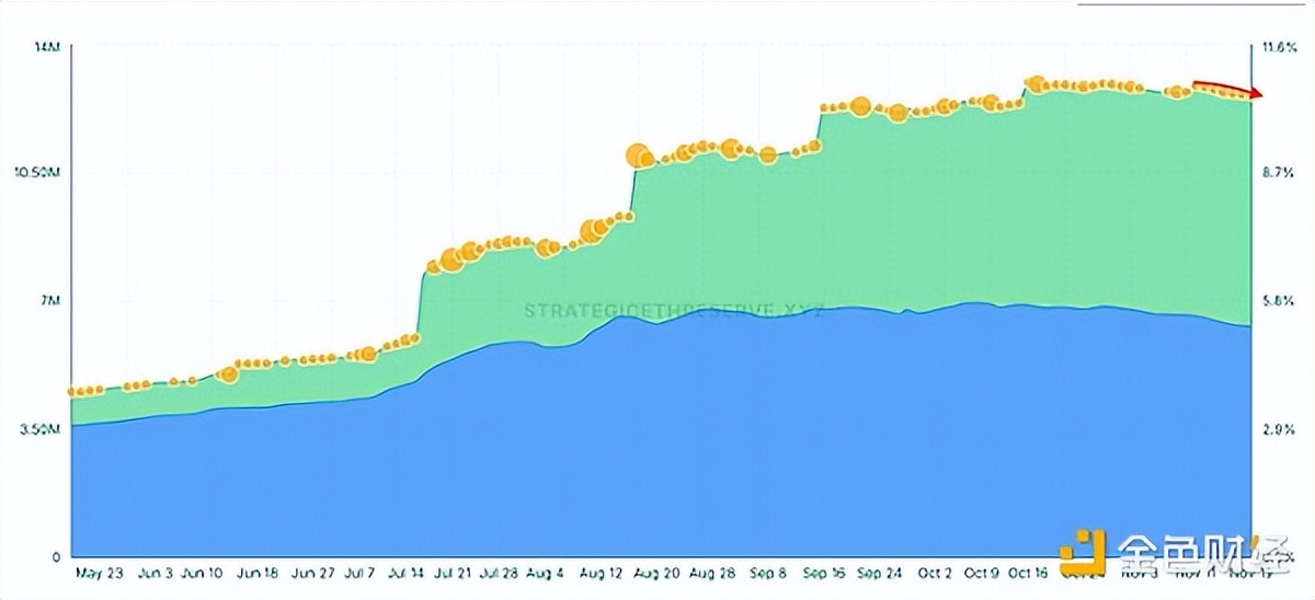 来自StrategicETHreserve.xyz的数据显示,自 11 月 11 日以来,战略储备和 ETF 的总持有量已减少了 280,414 ETH。
