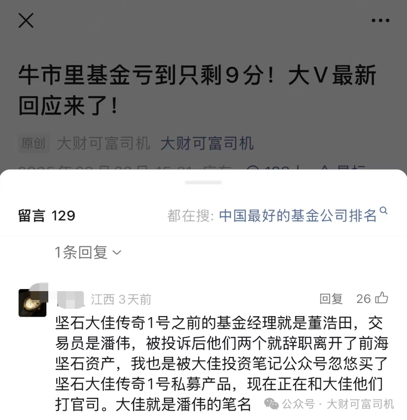 上篇文章留言中有数位持有人称:“‘坚石大佳传奇1号’之前的基金经理就是董浩田,交易员是潘伟。大佳就是潘伟的笔名。基金净值只有0.4的时候就辞职,撇清关系了。”