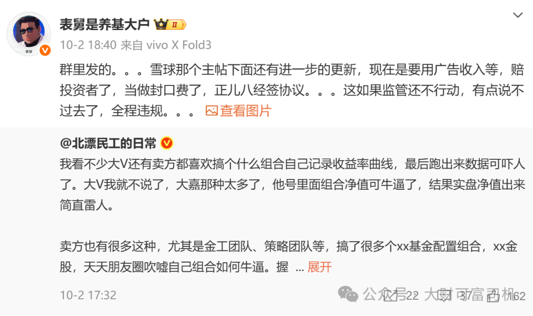 目前,“大佳割韭菜”已经走了仲裁流程。但大V这边依旧岁月静好:一边用 六年补偿稳住持有人,一边靠星球和广告赚着钱。财经大V“表舅是养基大户”的吐槽一针见血:“用广告收入赔投资者,当做封口费,正儿八经签协议。如果监管还不行动,有点说不过去了,全程违规……”