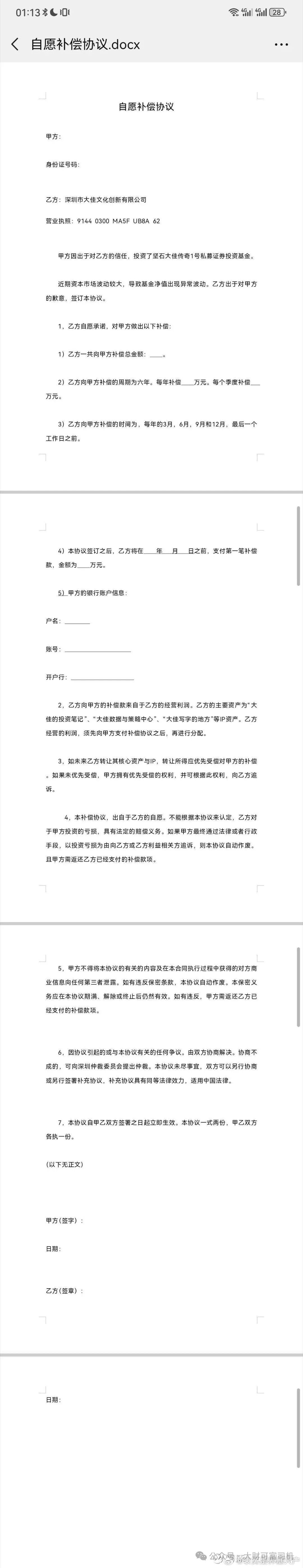 10月2日,财经大V“表舅是养基大户”微博贴出了大佳对于持有人的“自愿补偿协议”。协议显示,补偿协议签署的主体是“深圳市大佳文化创新有限公司”,大佳文化创新自愿承诺对持有人进行补偿。补偿款来源于大佳文化创新的IP资产,包括“大佳的投资笔记”“大佳数据与策略中心”“大佳写字的地方”。补偿周期为六年,每年的3月、6月、9月和12月最后一个工作日之前。