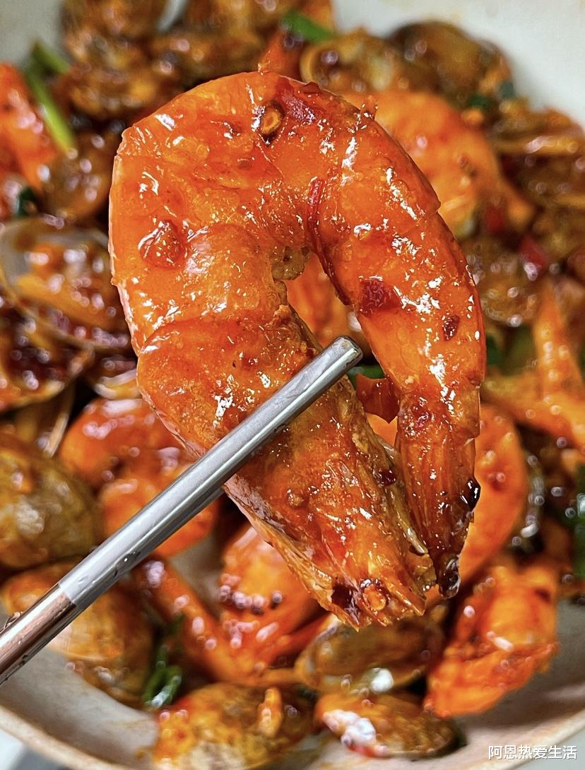 这时,先把大虾倒入锅中,大火快速翻炒至虾身变红。为什么要先炒虾?因为虾比花甲更难熟,先下锅才能保证两者同时达到最佳口感。