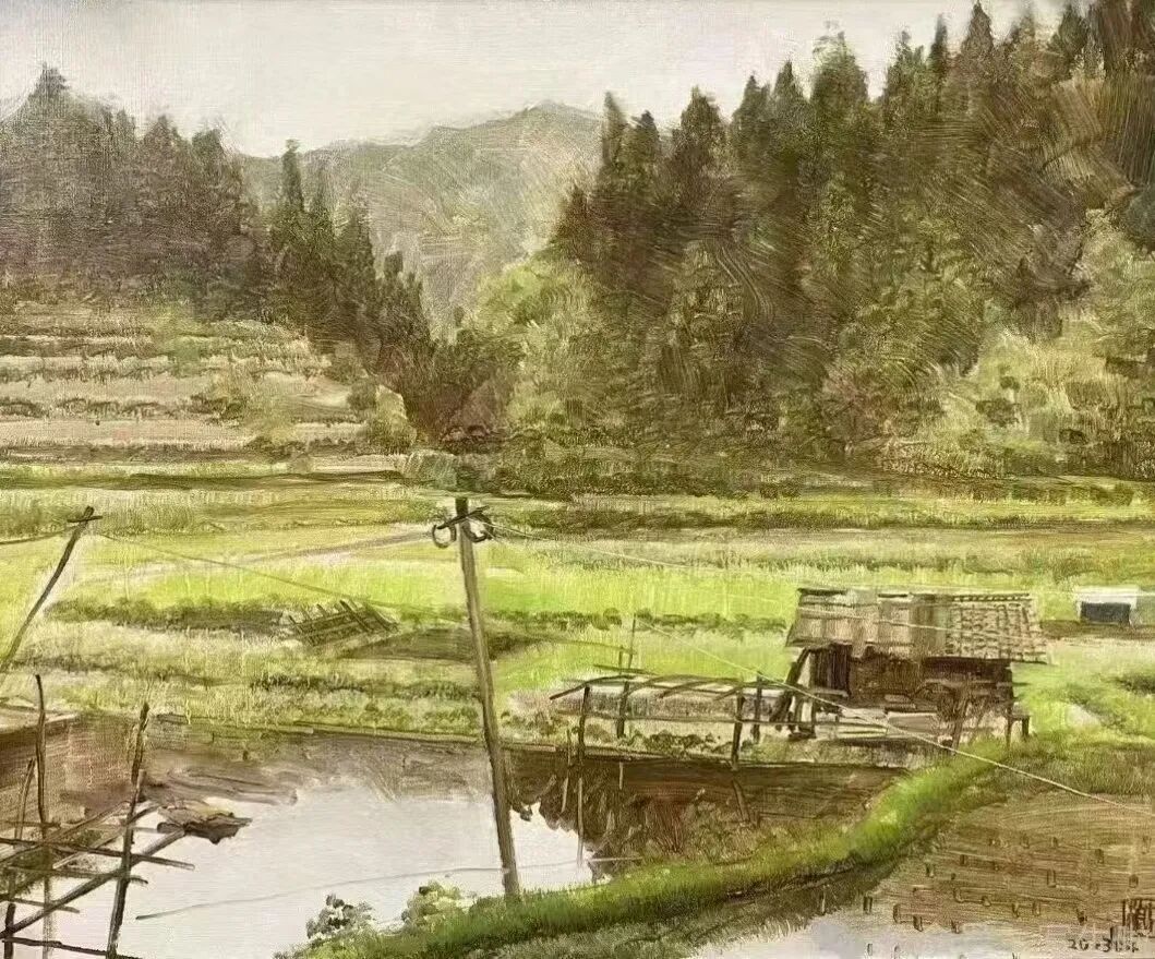 《幽静的侗族山寨》50x60cm 亚麻油彩 2024年 古棕