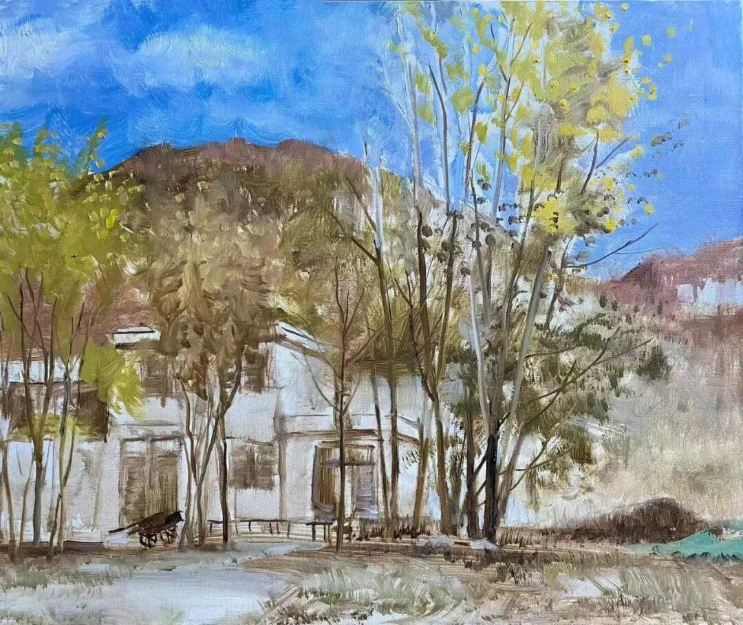 《阳光下的院中人》50x60cm 亚麻油彩 2024年 古棕
