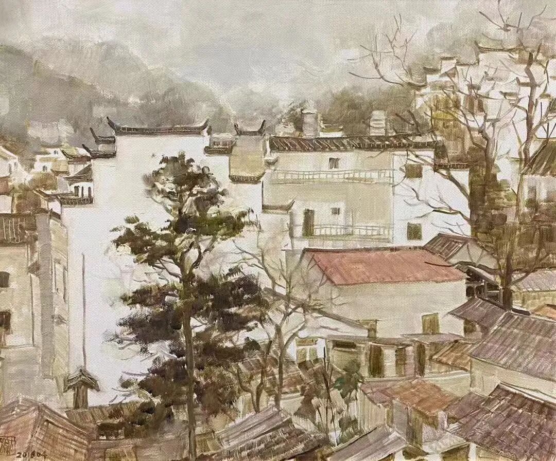 《雨中的查济古镇》50x60cm 亚麻油彩 2021年 古棕