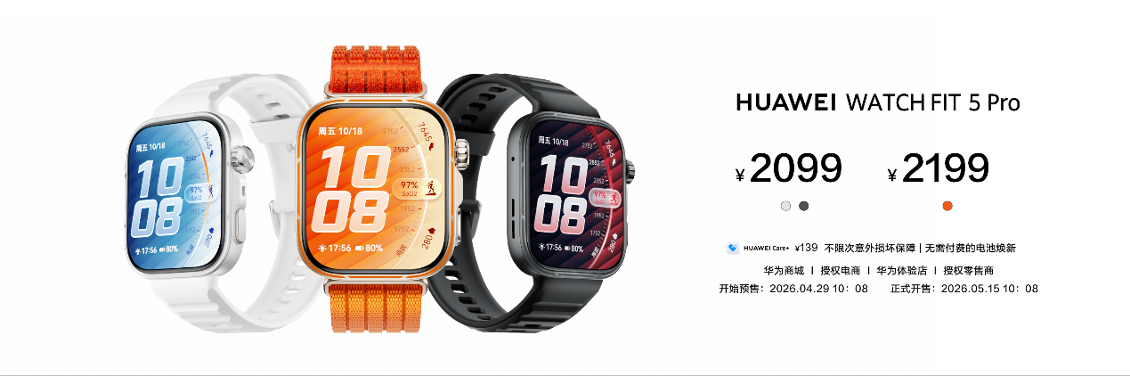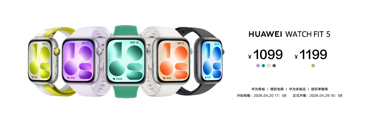 HUAWEI WATCH FIT 5现已开启预售,4月29日全渠道正式开售,售价1099元起,国补后到手价935元起。HUAWEI WATCH FIT 5 Pro将于4月29日开启预售,5月15日全渠道正式开售,售价2099元起,国补后到手价1785元起。用户可登陆华为商城及各大授权电商平台,或前往华为体验店、华为授权零售门店进行购买。